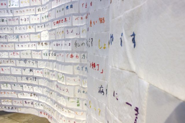 まず出迎えてくれるのが、奈良県出身の西尾美也氏による作品「声を縫う」。受刑者が残した「詩」を、200人以上の人々が刺繍した参加型作品です。
