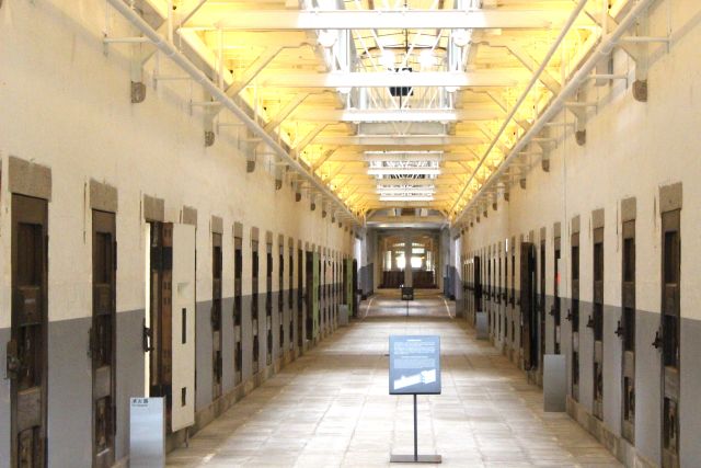 ミュージアムゲートを入ってまず足を踏み入れるのが、保存エリアとなっている「第三寮」。全96室の独居房が連なる空間はひんやりとした空気に包まれ、思わず背筋が伸びるような感覚を覚えます。