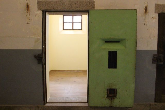 独居房には実際に入ることもできます。監視窓を備えた重厚な木製扉や、3畳ほどの空間は想像以上の閉塞感です。