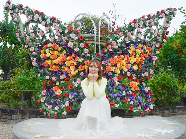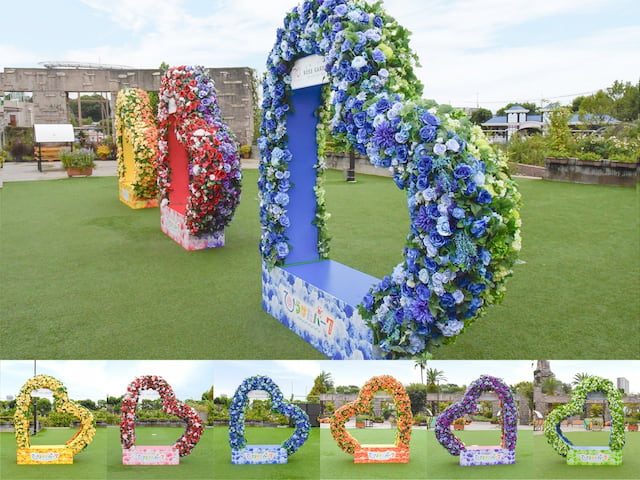 ほかにも、バラのフェイクフラワーで装飾された蝶々や、イエロー、レッド、ブルー、オレンジ、パープル、グリーンという6色のバラが楽しめるハート型のベンチなど、記念撮影にもってこいのスポットが満載です。