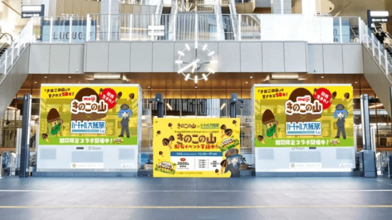 さらに「バーチャル大阪駅 4.u」内ジャックブースエリアや時空の広場エリアには本コラボにまつわるポスターを多数掲出中。「きのこの山」であふれた特別な空間は2026年5月27日(水)までの期間限定です!