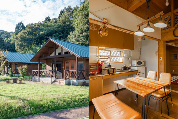 南丹市日吉町にある「ひよしフォレストリゾート山の家」は、北山杉をはじめ、多くの木々に囲まれた自然あふれる、まさに森のリゾート。こちらでは各コテージにバーベキュー設備が用意されているほか、本館施設の天然温泉も利用できます。写真は12人用コテージ。目の前には小川が流れていて、サワガニ採りなどの自然遊びも楽しめますよ。