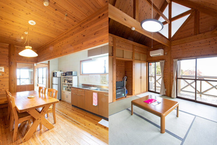 上桂川沿いにある「宇津峡公園」は、予約不要のデイキャンプや川遊びができると人気のスポット。こちらのコテージは、1棟戸建てタイプと2棟一対タイプの2種類あります。1棟戸建てタイプ(写真)は、リビングの奥に12畳の畳スペースが設けられた和タイプの部屋。室内にはロフトも設置されているので、広々と使うことができますよ。