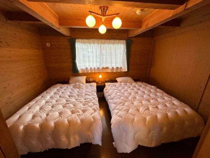 2023年4月には、四季を彩る木々に囲まれた環境でゆったりと過ごすことができる「森のコテージ」が登場しました。こちらはふるるファームで唯一、ダブルベッドが2台も用意されている贅沢空間! 外でのアクティビティはもちろん室内でも存分にリラックスできますよ。