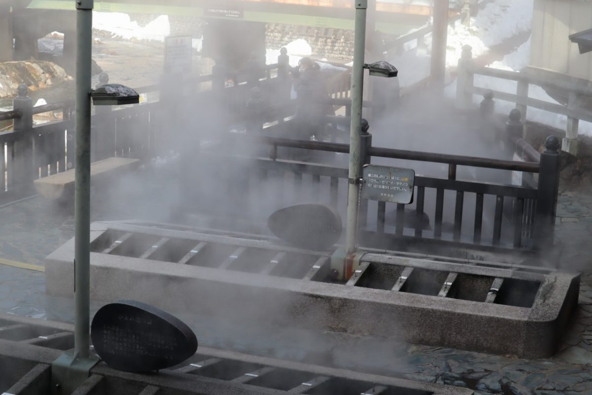 荒湯付近から河川敷に降りると天然かけ流しの足湯があり、雪の中の散策で冷えた足をあっためることができます。