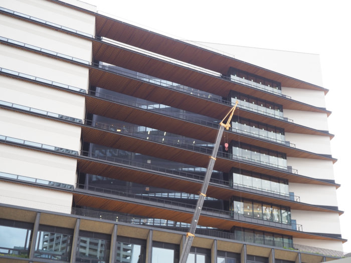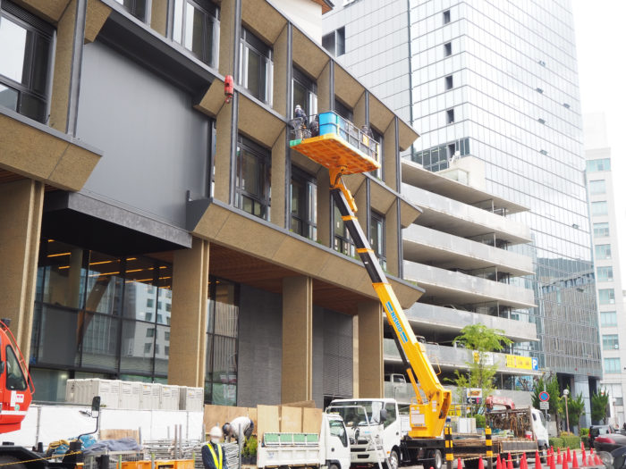 下層部分の外壁には、縦横のラインに「植物」が植えられるんですが、その方法はなんと「高所作業車」で外から植え込むというもの。