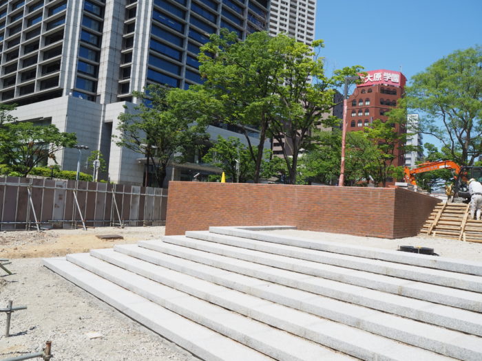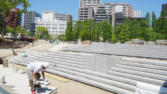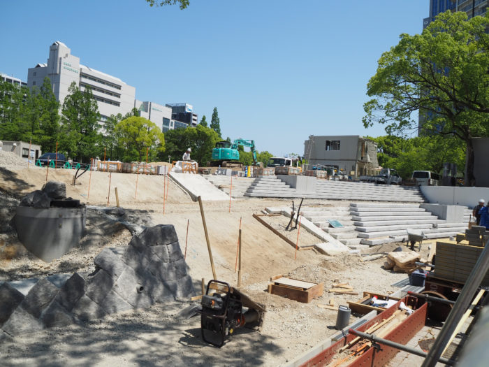 リニューアル工事中の「東遊園地」西側に、新しい階段ができてきてる。より入りやすい公園になる?