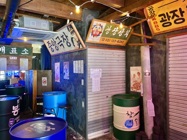 一歩お店に入ると、シャッターが下りた屋台や電信柱など韓国の路地裏のような空間が広がります。看板は、韓国で制作されたオリジナルのものなのだそう。