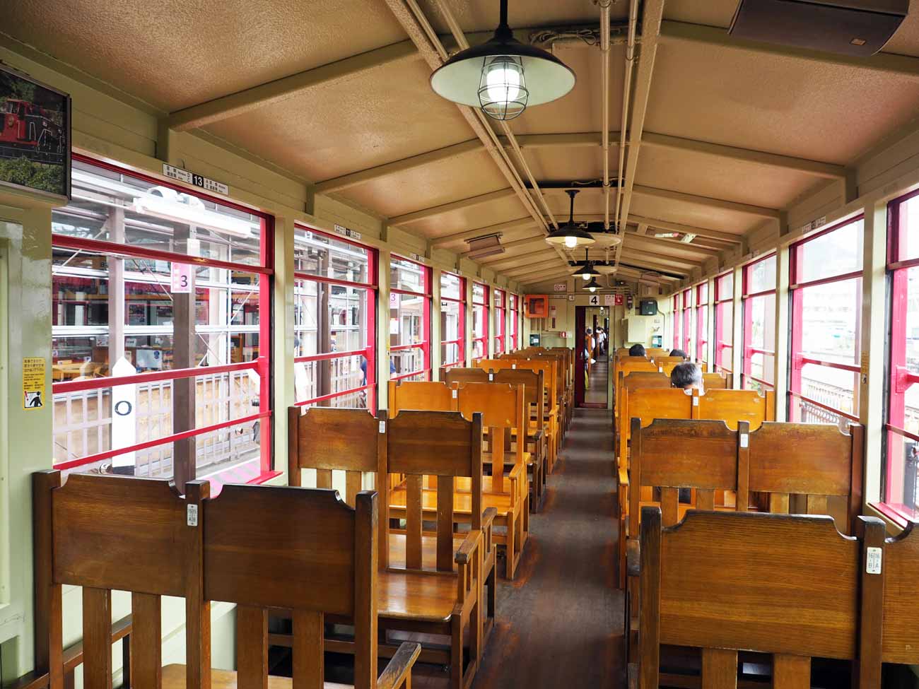 座席は全車指定席。車輌は木製椅子と裸電球があるレトロな4両(写真左)と、オープン車両の「リッチ号(写真右)」が1両という5両編成が基本。中でも窓ガラスが無く、風や光を肌で感じることができる「リッチ号」はとっても人気です。