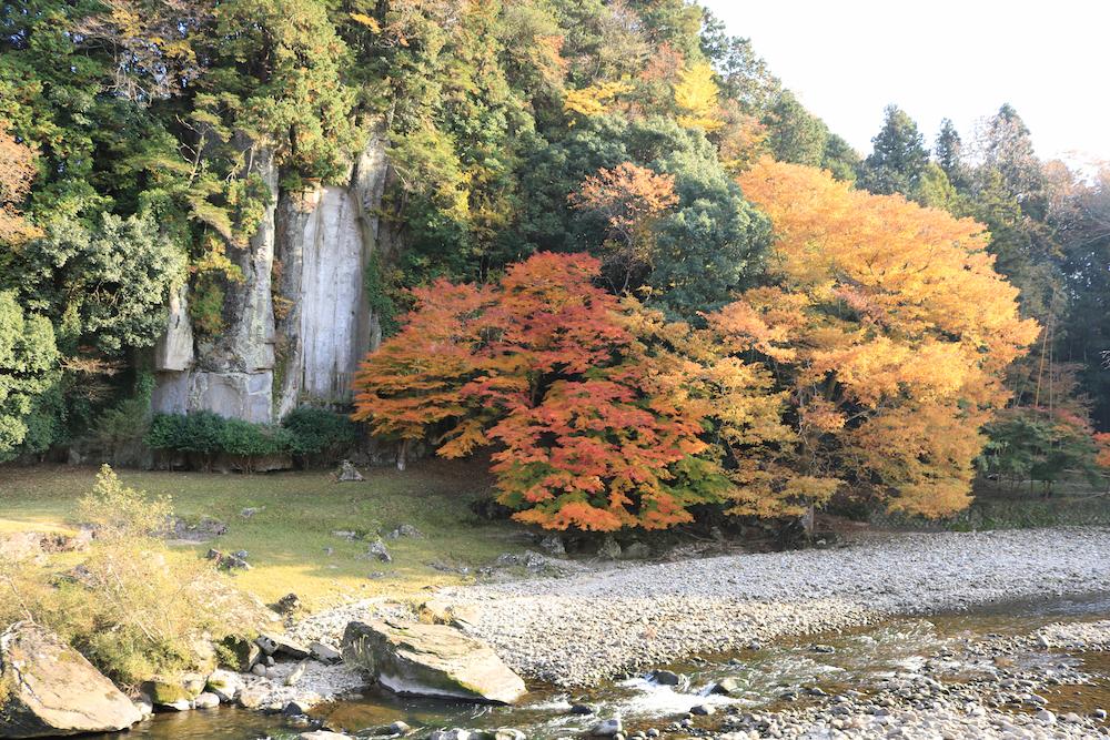 宇陀川を隔てて対岸の岸壁には、鎌倉時代初期に後鳥羽上皇の祈願で造立されたという国内最大級の線刻弥勒磨崖仏が刻まれています。秋には磨崖仏の脇を紅葉が彩り、前を流れる宇陀川とともに大スケールの景色を楽しむことができます。