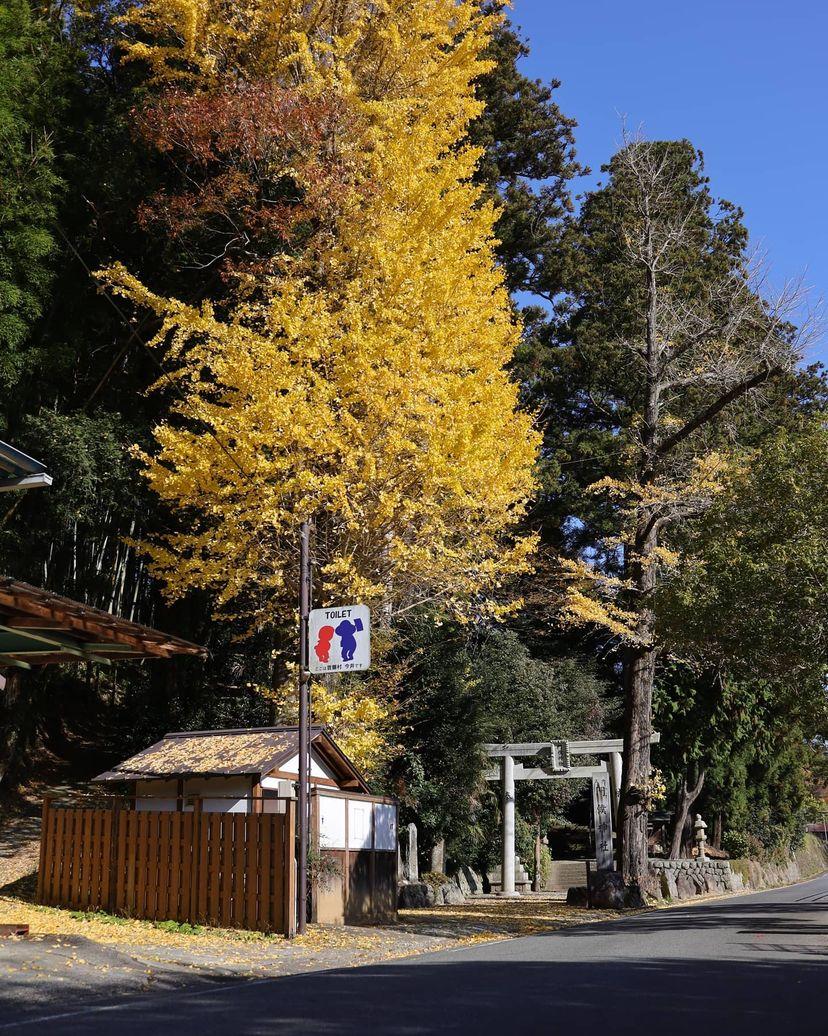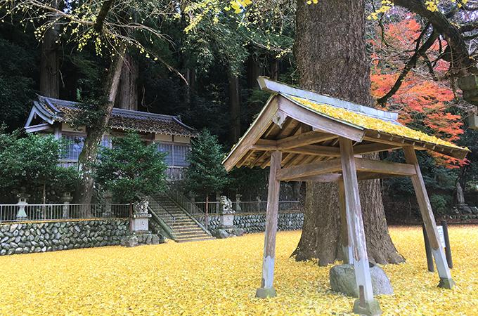 秋祭りに奉納される「曽爾の獅子舞」が有名な同社の鳥居前にはイチョウの巨木が立っています。葉の上に実を付ける珍しい「オハツキイチョウ」は奈良県の天然記念物に指定されています。