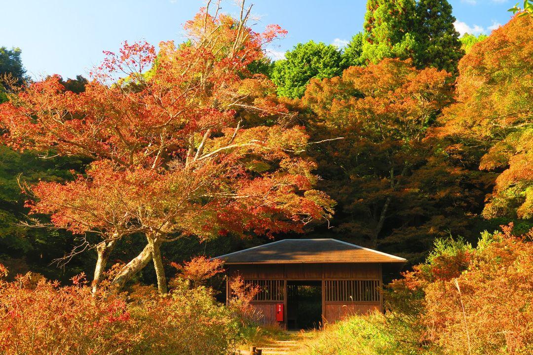 聖徳太子の創建と伝わり、宇陀松山藩の祈願所にもなった古刹。紅葉時期は本堂に向かう参道にモミジやイチョウなどが色づき境内を彩ります。庫裏のレストランでいただく薬草料理(要予約)も有名で、紅葉を眺めながら料理を楽しむのも◎