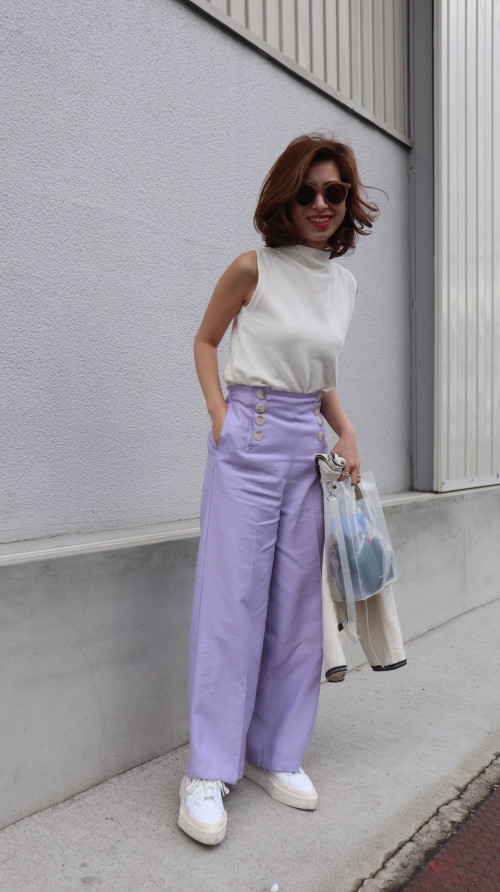 特に写真をたくさん撮ることが多い友達との旅行は、脚を長く見せられる厚底スニーカーがおすすめ。アクセントに色物アイテムを入れて、全体を淡くまとめると簡単にキレイめスタイルが完成します!