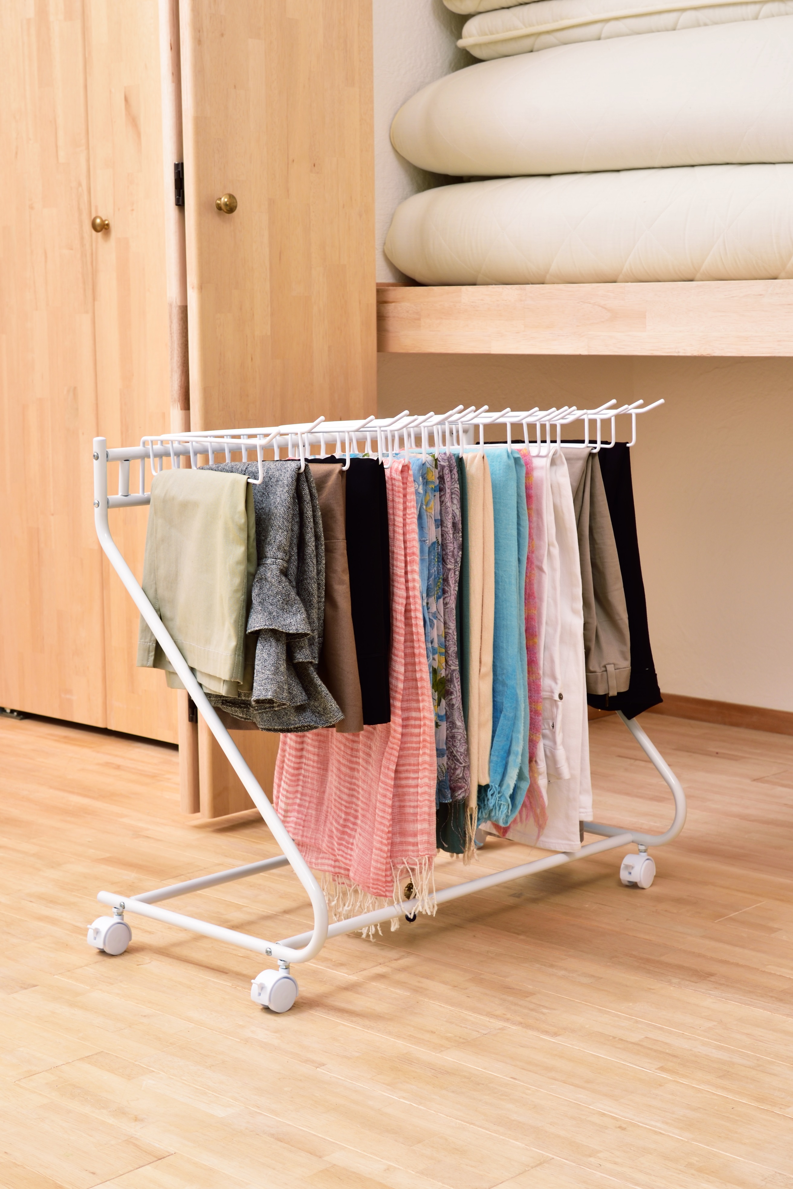 一本一本がハンガーになっていて、デニムだけでなく、どんなアイテムも吊るせるようになっています。デッドスペースが空きがちなクローゼットの下に収納すると、場所もとらないしコーディネートをその場で考えられるので一石二鳥。
